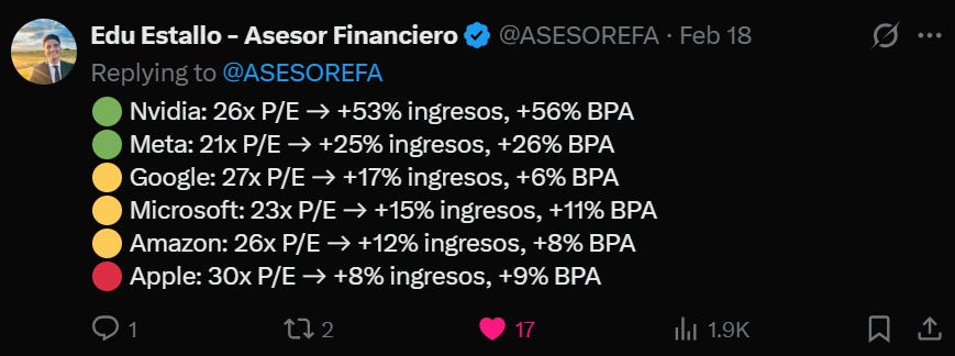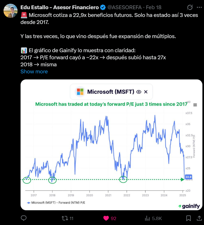 Ahora bien, que el índice tecnológico Nasdaq esté en retroceso este año no debería sorprender. Con una valoración que llegó a superar un P/E de 40, el índice se encontraba claramente en niveles exigentes, por lo que una corrección era esperable. Aun así, aunque sigue cotizando con múltiplos elevados, ya no es el sector más caro del mercado. Más adelante comparto la tabla comparativa de valoraciones por sectores.