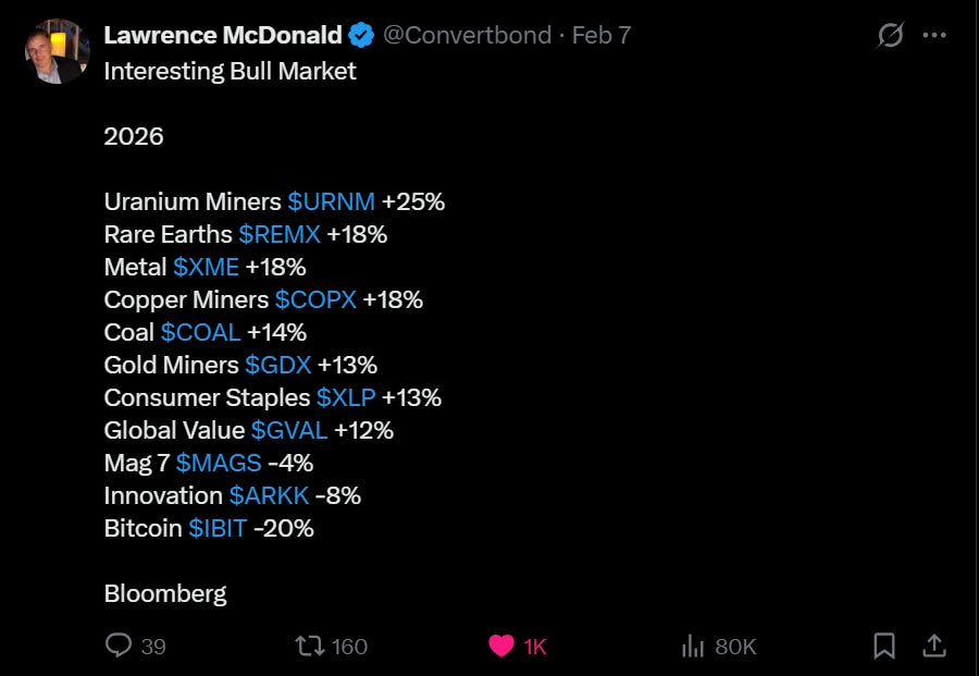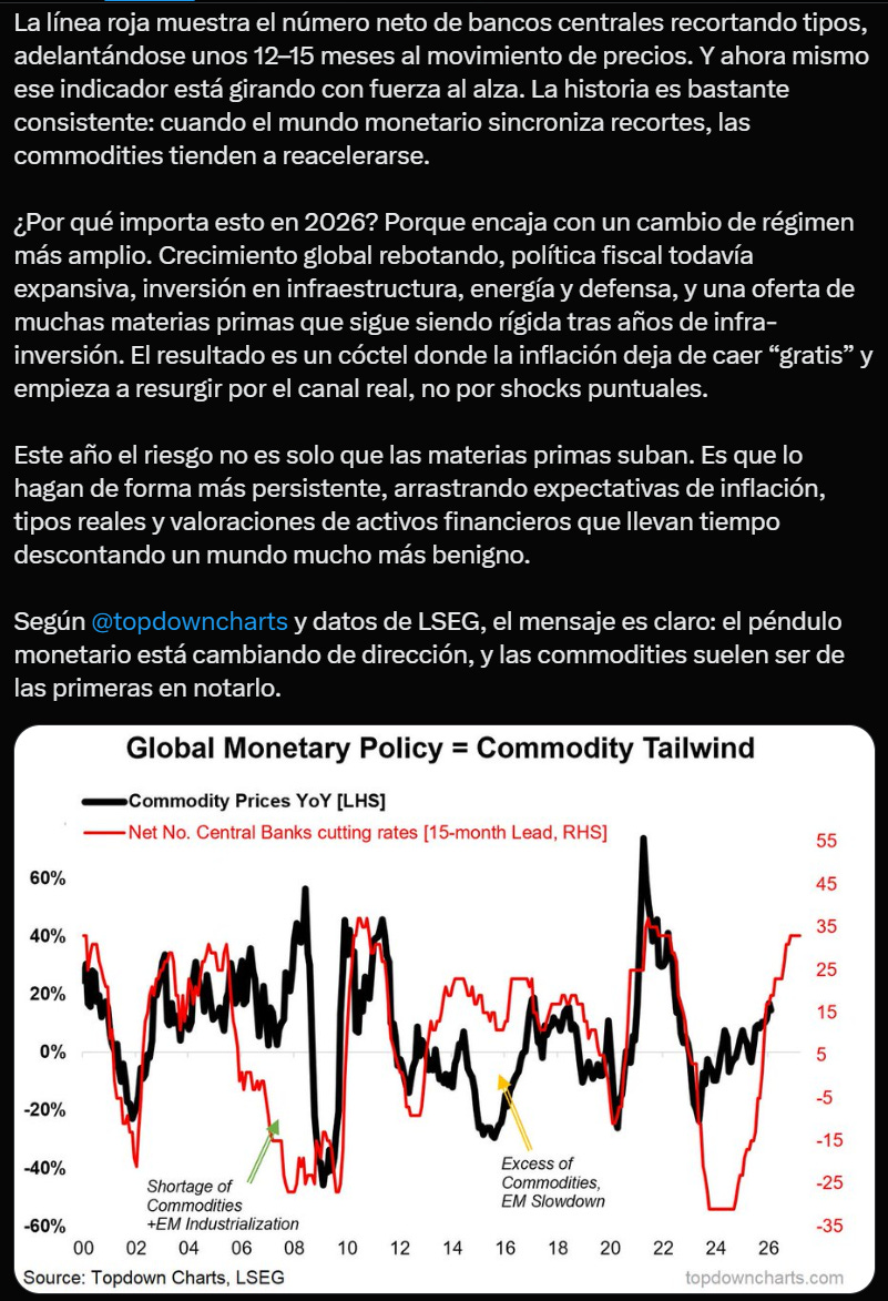 Hay una rotación clara hacia hard assets, value y sectores defensivos, mientras que financials y growth pierden momentum. Esto es típico de un mercado que empieza a descontar desaceleración + posibles recortes de tasas, pero con incertidumbre macro todavía presente.