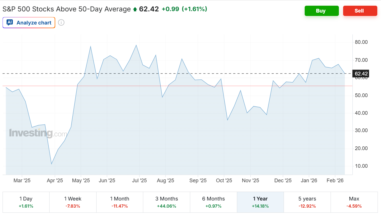 El 62.4% de las acciones del S&P 500 cotiza por encima de su media de 50 días, lo que indica que la amplitud del mercado es positiva y que el movimiento no está concentrado únicamente en unas pocas mega caps. No es un nivel extremo de sobrecompra —eso suele verse por encima del 80%—, pero sí refleja un entorno constructivo donde la tendencia de corto plazo favorece a los compradores. Mientras este indicador se mantenga por encima del 50%, el impulso técnico sigue siendo saludable; una caída sostenida por debajo de ese umbral sería la primera señal de pérdida de amplitud y posible debilitamiento del rally.