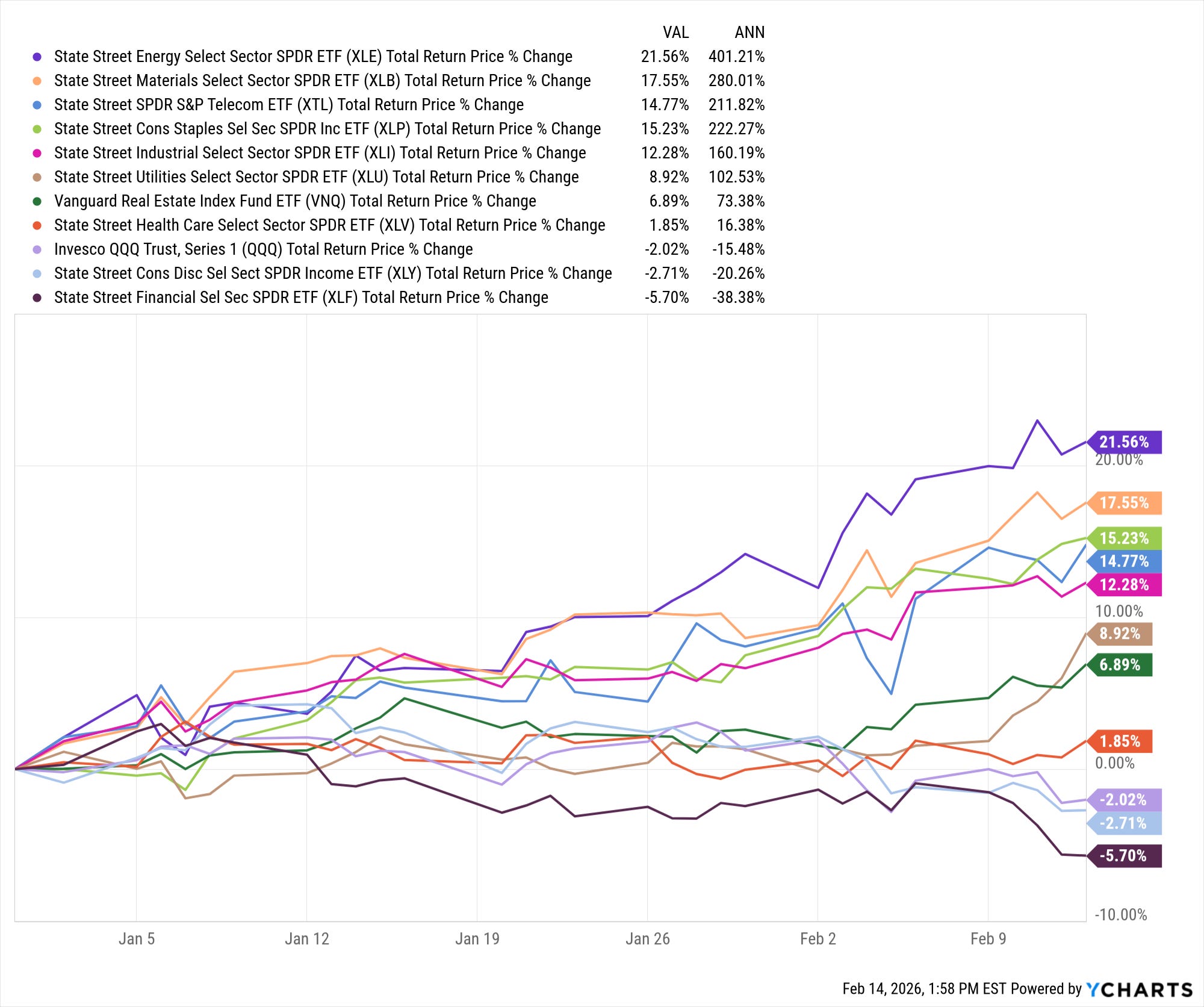 1️⃣ Energy (XLE): +21.56%